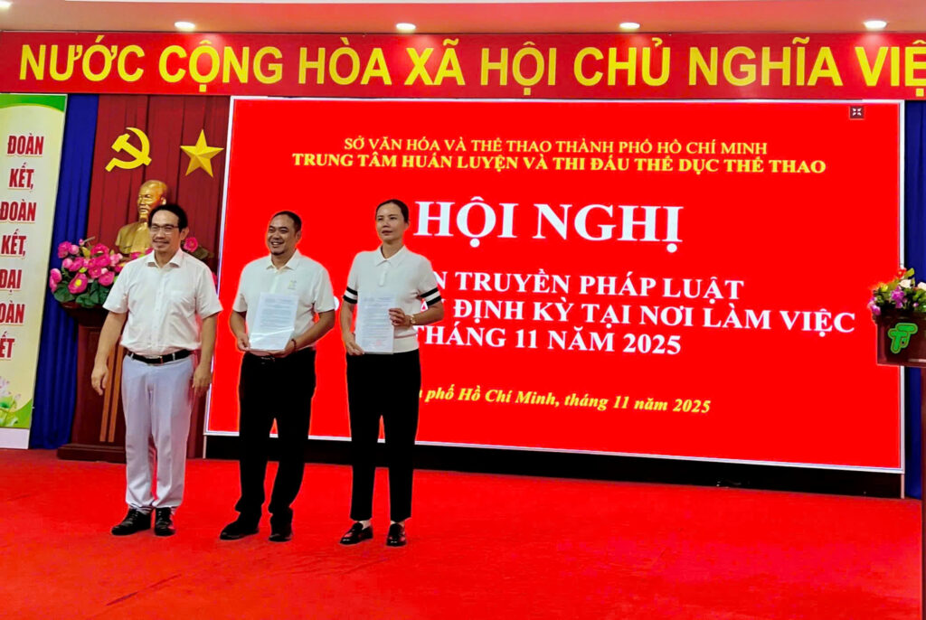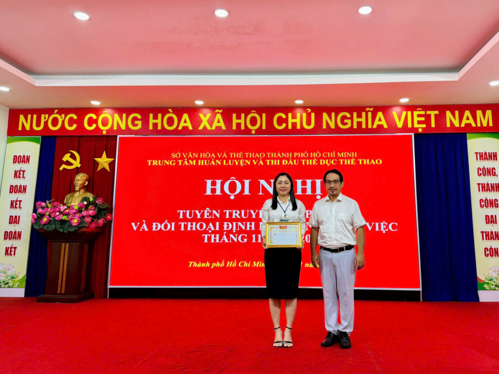 Bên cạnh đó, Trung tâm đã trao Quyết định nâng lương thường xuyên cho 04 viên chức, ghi nhận nỗ lực và quá trình phấn đấu của các cá nhân trong công tác. Đồng thời, trao Bằng khen Ủy ban Nhân dân Thành phố Hồ Chí Minh cho cá nhân Bà Huỳnh Thị Yến Oanh đã có thành tích xuất sắc trong công tác biên soạn và tham mưu Nghị quyết về chế độ đặc thù trong lĩnh vực thể thao – một văn bản quan trọng, góp phần hoàn thiện cơ chế chính sách, tạo động lực cho đội ngũ huấn luyện viên, vận động viên và viên chức toàn ngành.