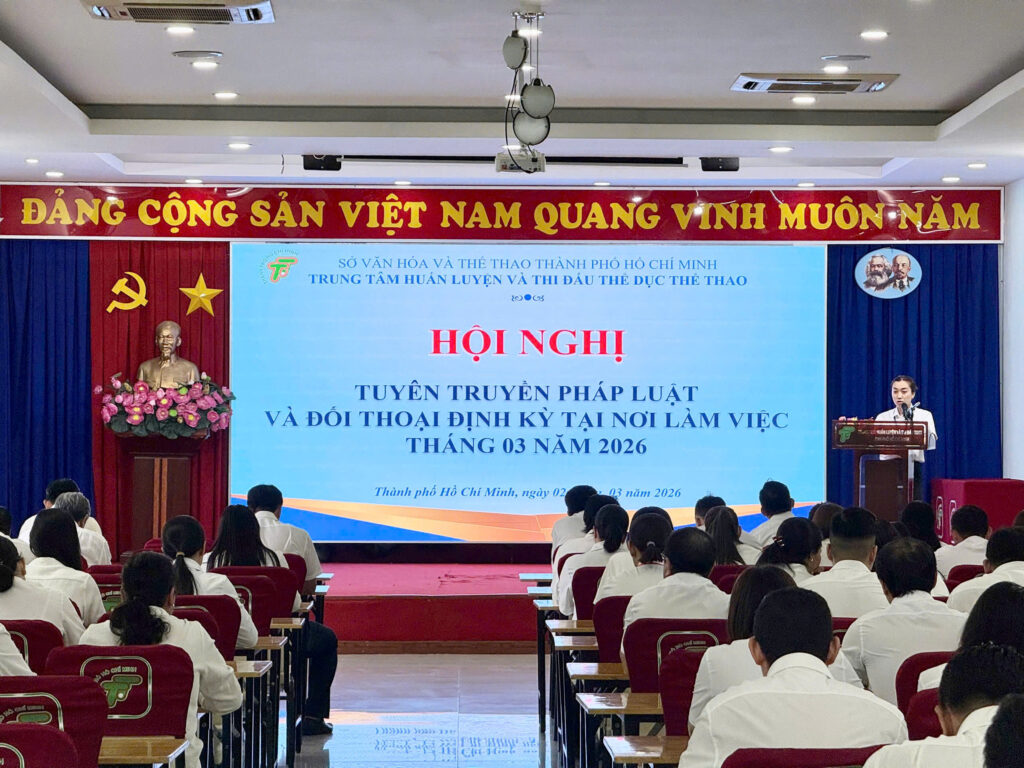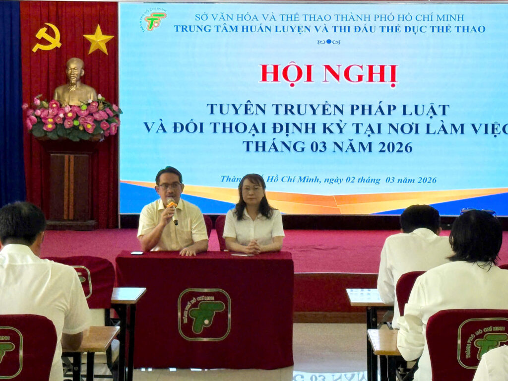 Sáng nay, Trung tâm Huấn luyện và Thi đấu Thể dục thể thao Thành phố Hồ Chí Minh đã tổ chức buổi sinh hoạt định kỳ tháng 3 với sự tham dự của Ban Giám đốc cùng toàn thể viên chức, người lao động đơn vị. Chương trình diễn ra nghiêm túc, thiết thực, tập trung vào công tác thông tin chính sách mới và tăng cường trao đổi, đối thoại nội bộ.